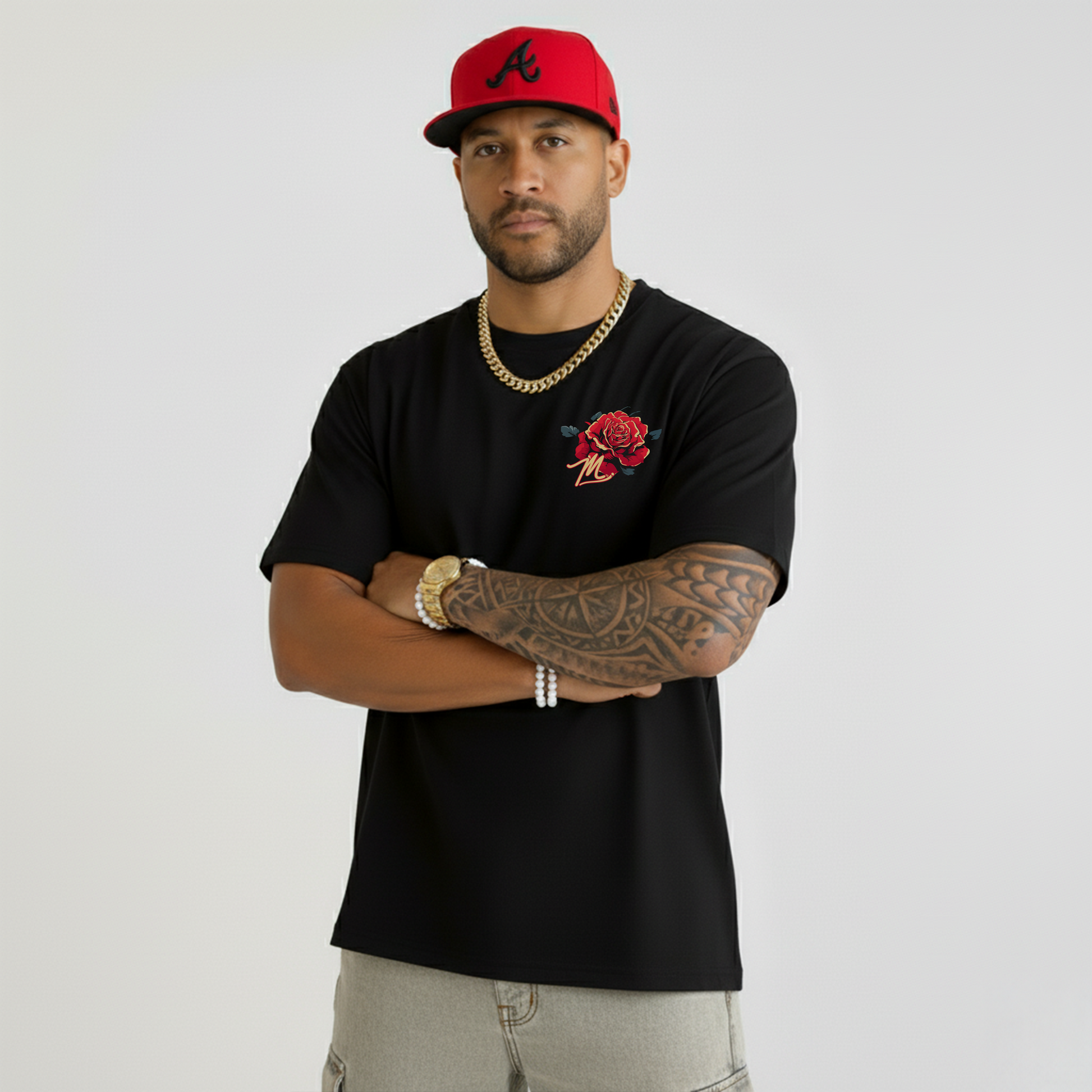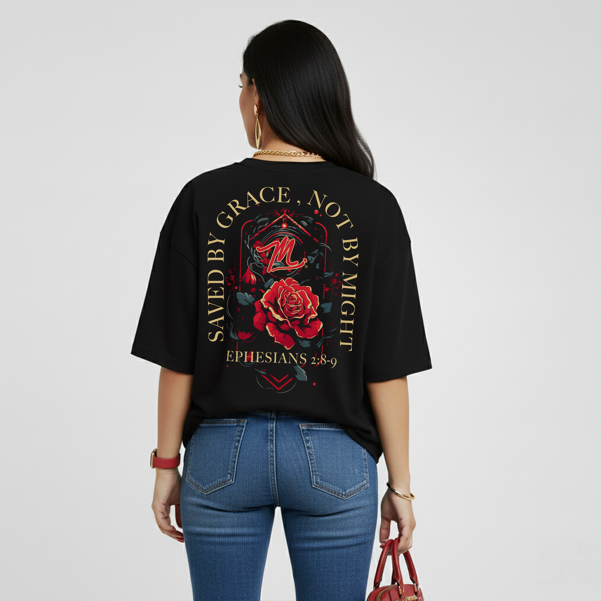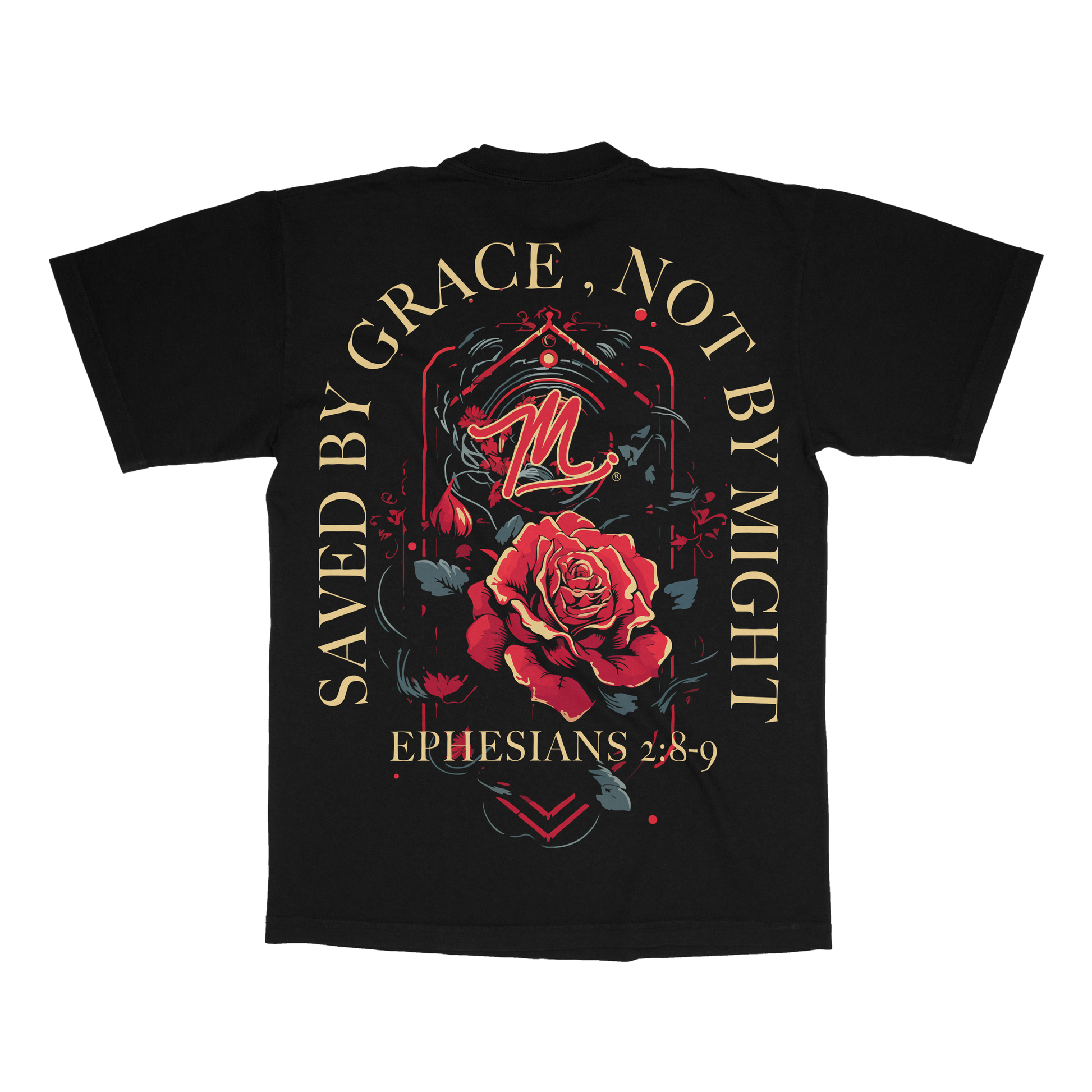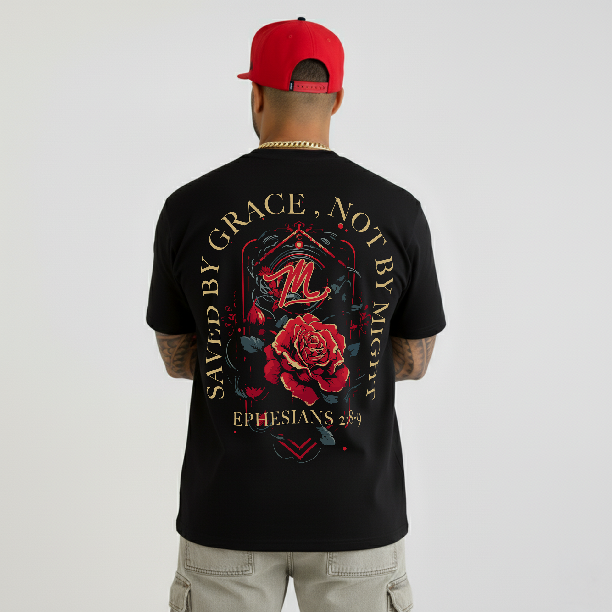 This tee is a simple but honest reminder of that truth that you were never saved by your own doing, but by the mercy and love of God. Inspired by Ephesians 2:8-9, the back design boldly reads “Saved by Grace, Not by Might,” framed with a deep red rose that symbolizes redemption and renewal.